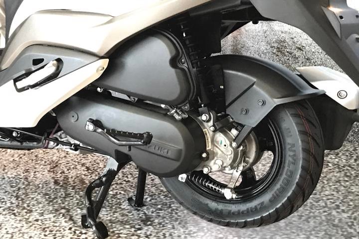 They used a telescopic fork in front and hydraulic mono-shock suspension in the rear wheel. The front alloy wheel is 2 inches bigger than the rear rim which is 12 inches. 90/90 sections tubeless tyres are used in front and rear wheels.