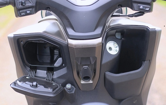 There are 2 hooks for carrying luggage at the near rider’s feet. The rider has a rack of an equal volume of 2 liters near the rider’s hand to hold a pot of water from 1 to 1.5 liters. On the left side, there is another Glovebox that will get a DC socket for mobile charging. You can install the mobile charge option at any time if you want.