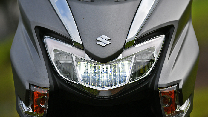 The headlamp unit looks stunning, U shaped and LED. The indicator lights are also beautifully adjusted to the body. Front end chromium finished gives it a decent look. The maxi-scooters windscreen is usually a bit larger, where the Burgman Street 125 windscreen is a little smaller. It was originally designed to conform to the design of the scooter.