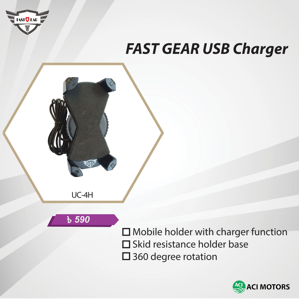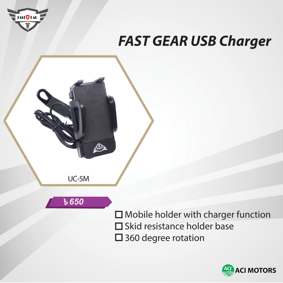 - Fast Gear USB Charger (UC – 4H & UC – 5M) – There are two USB chargers available among Yamaha accessories collection. One of them is UC – 4H which has BDT 590 price included. The other one is UC – 5M. It’s price is BDT 650. Both have same features added but the looks are pretty different. The features are mobile holder with charger function, skid resistance holder base and 360 degree rotation.