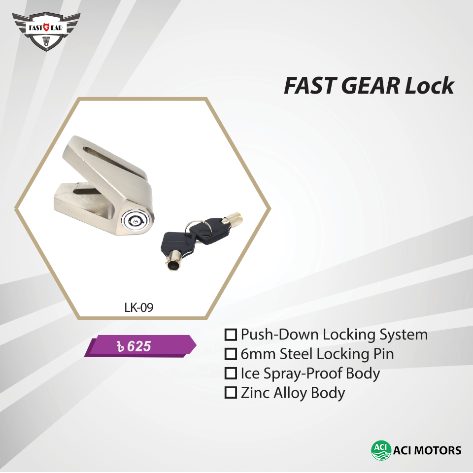 - Fast Gear Lock (LK – 09) – It is a security lock with some advanced features. It has push down locking system, 6mm steel locking pin, ice spray proof and zinc alloy body. Price of the lock is BDT 625 only.