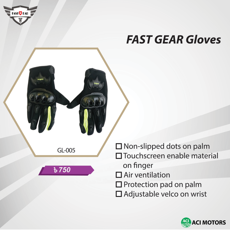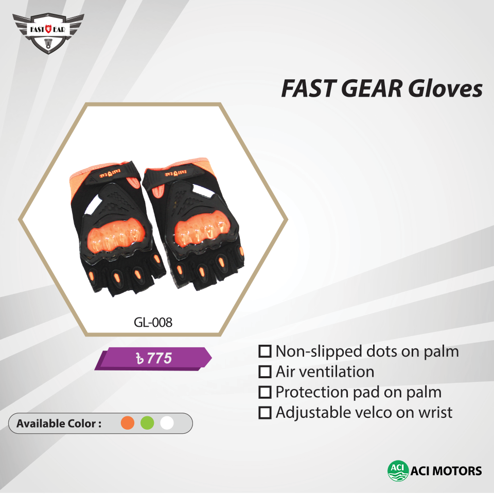 - Fast Gear Gloves (GL – 008) – The current price of the gloves is BDT 775. It has also same features like non-slipped dots on palm, air ventilation, protection pad on palm and adjustable velco on wrist. Three different colors of the gloves are available.