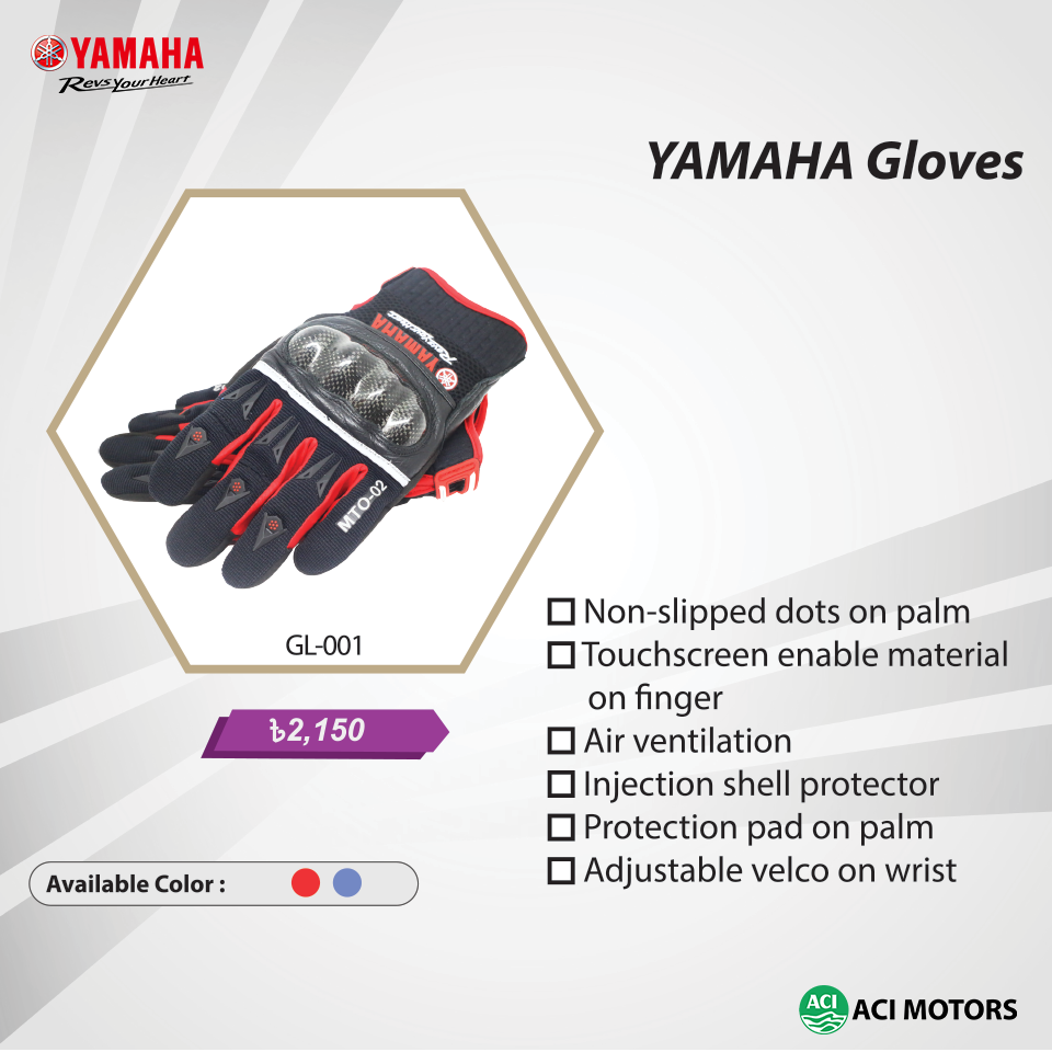 - Yamaha Gloves (GL – 001) – Among all available Yamaha Gloves, GL- 001 is the best. It consists of non-slipped dots on palm, touchscreen enable material on finger, air ventilation, injection shell protection, protection pad on palm and adjustable velco on wrist. There are two colors of the gloves available and the price of the product is BDT 2,150 only.