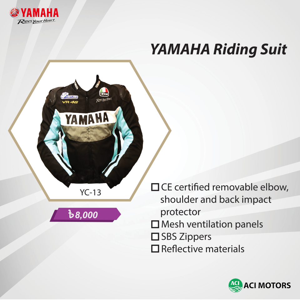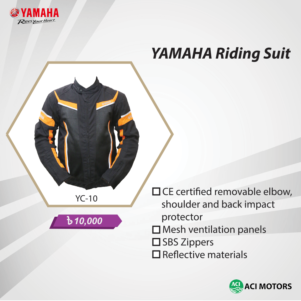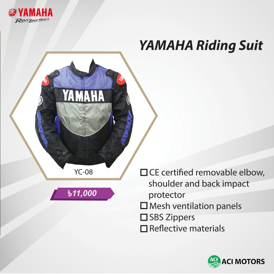 - Yamaha Riding Suits (YC – 08, YC – 10 & YC 13) – All three types of Yamaha Riding Suits are available in the stock of Yamaha gear accessories. And also most of the features of these things are almost same. They have CE certified removable elbow, shoulder and back impact protector, mesh ventilation panels, SBS zippers and reflective materials. The price of YC – 08 is BDT 11,000 only where the price of YC – 10 is BDT 10,000 and price of YC – 13 is BDT 8,000 only.